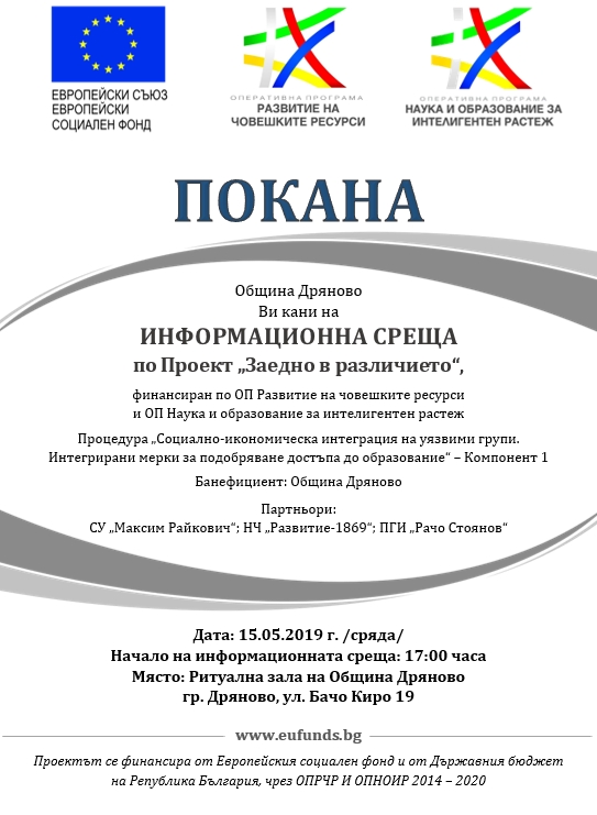Община Дряново организира информационна среща, като част от дейностите по проект "Заедно в различието". Целта на публичното събитие е да се разясни интегрирания подход на проекта, да се идентифицират мерките за подобряване на социалното включване на маргинализираните общности от сегрегираните райони, изграждане на позитивни нагласи и модели на общуване, както и умения за ефективна работа и взаимодействие между лицата от етнически малцинства и маргинализираните групи и здравния и образователни медиатори, които ще бъдат назначени по проекта, общностни работници, които работят в и с уязвими общности и родители.