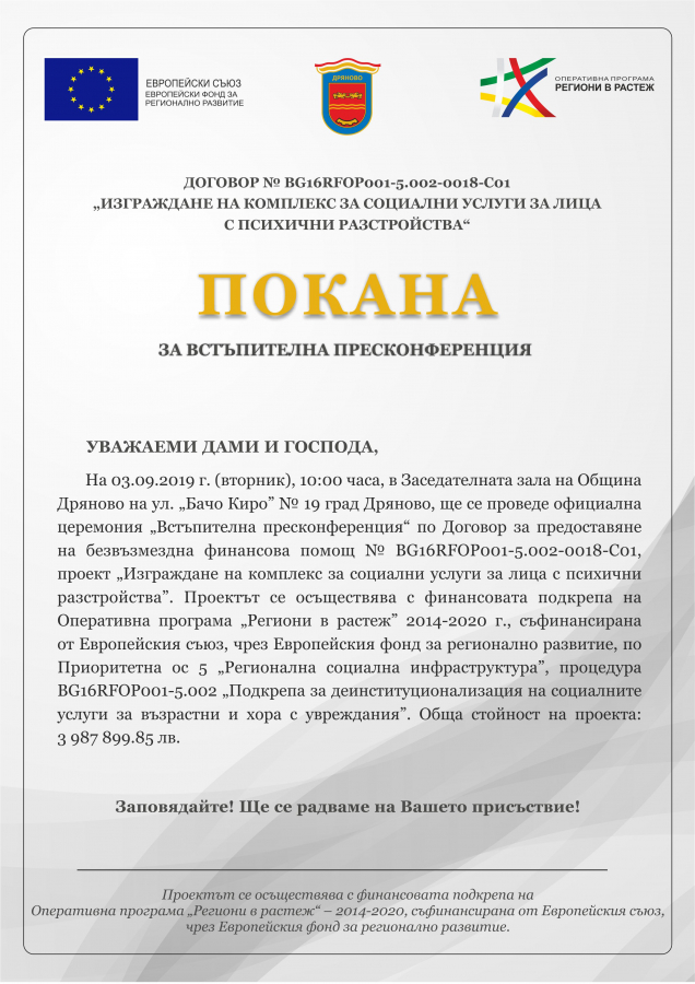 Община Дряново кани всички заинтересовани лица на встъпителна пресконференция по проект „Изграждане на комплекс за социални услуги за лица с психични разстройства“. Мероприятието ще се проведе на 3 септември, от 10:00 часа, в Заседателната зала на Община Дряново. Проектът се финансира по ОП „Региони в растеж“, приоритетна ос „Регионална социална инфраструктура, процедура BG16RFOP001-5.002 „Подкрепа за деинституционализация на социалните услуги за възрастни и хора с увреждания”.