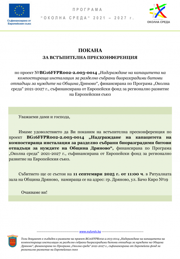 Каним Ви на встъпителна пресконференция по проект „Надграждане на капацитета на компостираща инсталация за разделно събрани биоразградими битови отпадъци за нуждите на Община Дряново“.