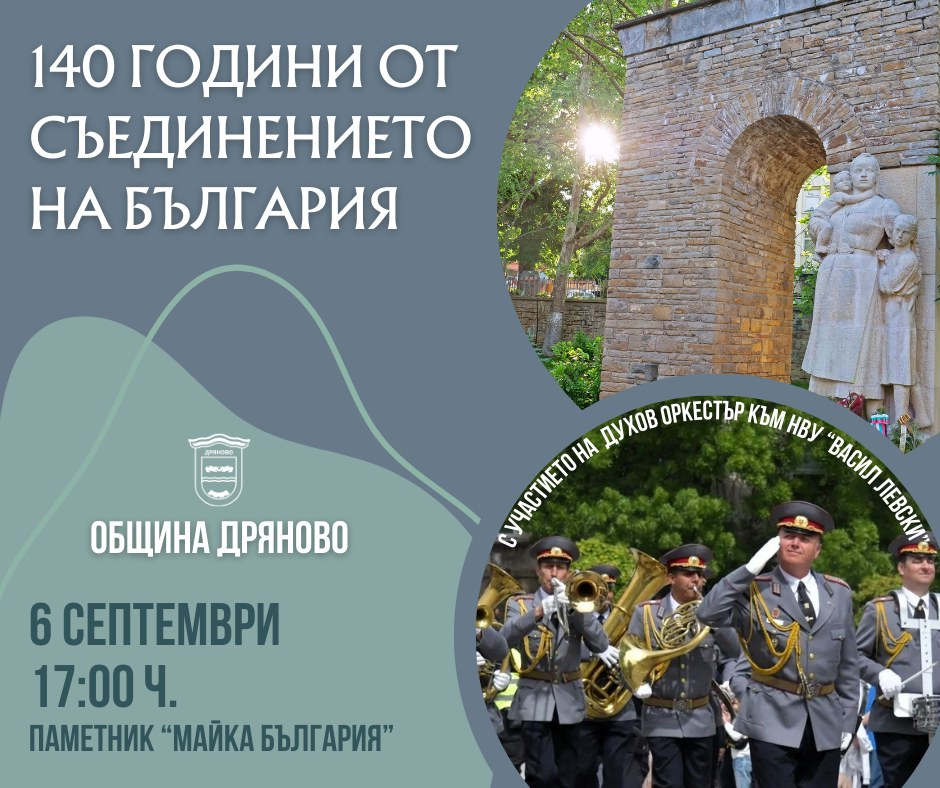 Община Дряново отправя покана към всички жители и гости на града за тържествено отбелязване на 140 години от Съединението на България и Източна Румелия!
