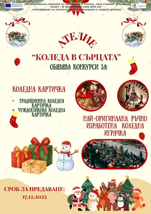 В рамките на проект BG05SFPR001-1.004-0019-C01„Утвърждаване на интеркултурното образование в община Дряново“, ПГИТ "Рачо Стоянов" организира дейности в Ателие "Коледа в сърцата" и обяввява конкурси, със срок за подаване на материалите до 17.12.2025 г.