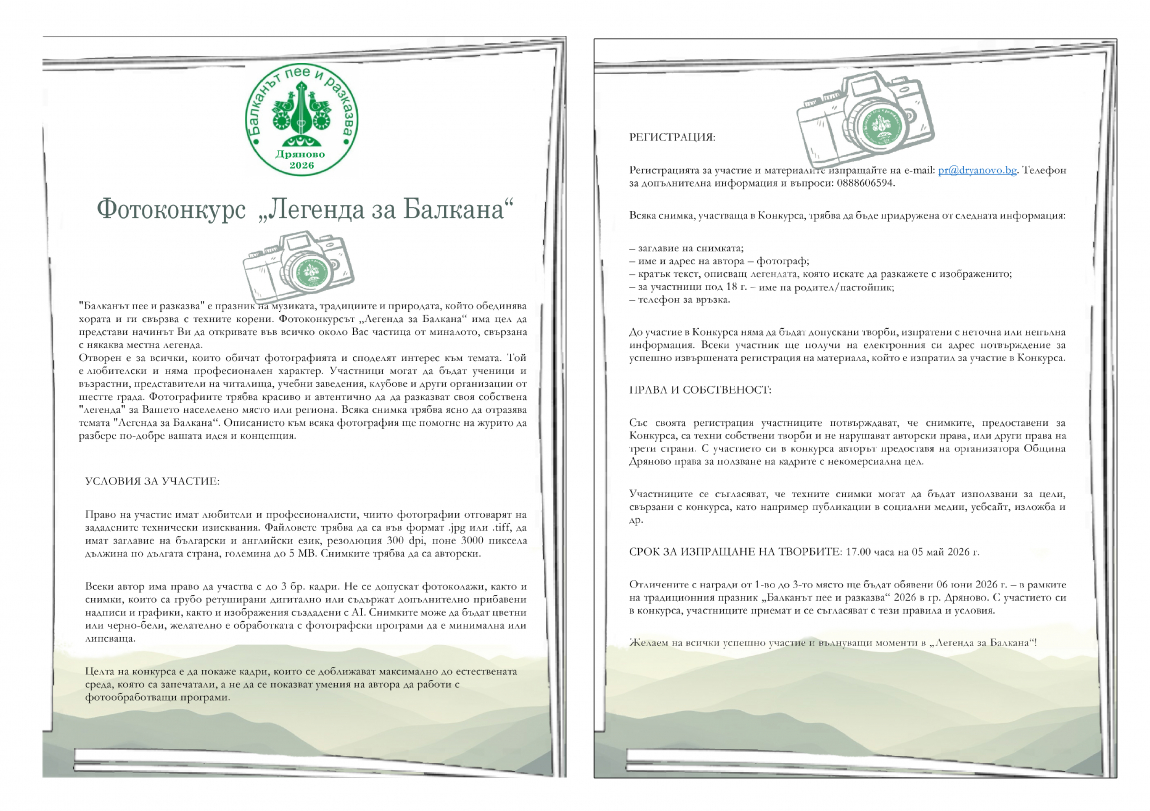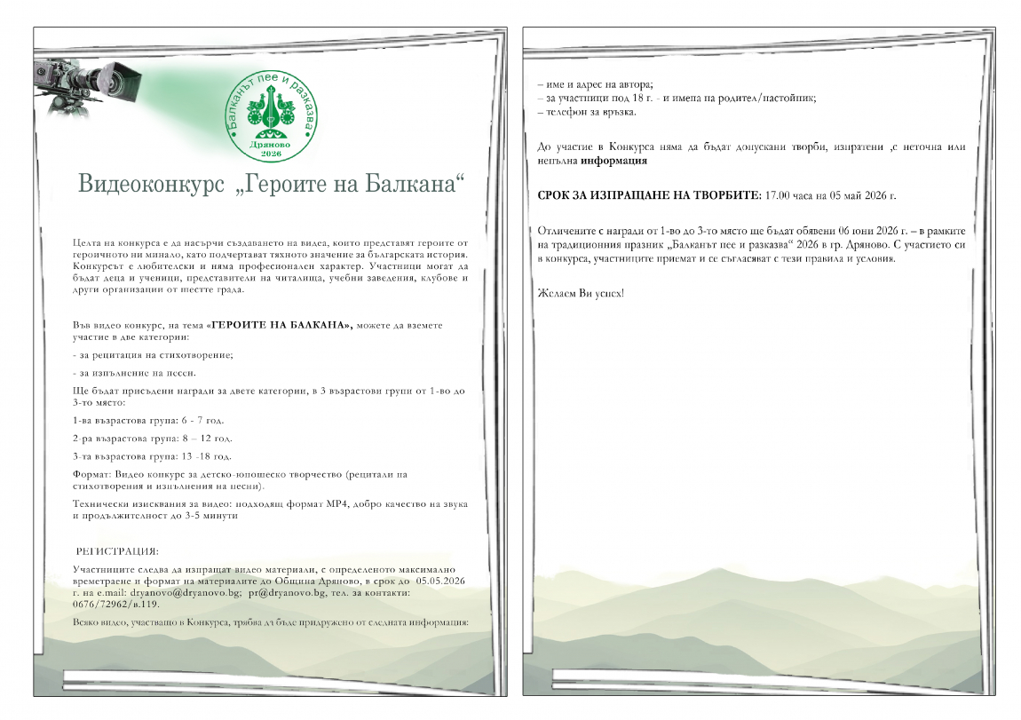 Представители от тези градове ще могат да вземат участие в няколко конкурса – кратки видеа, включващи изпълнение на стихотворение или видео по темата, озаглавен „Героите на Балкана“, както и фотоконкурс, „Легенда за Балкана “. Единият от конкурсите е само за деца и ученици, разделени в 3 възрастови групи, а другият ще даде поле за изява на желаещите от всички възрастови групи. И двата конкурса са награден характер, като класиралите се на първите 3 места ще получат своите награди в рамките на провеждането на фестивала „Балканът пее и разказва“ на 06 юни 2026 г.